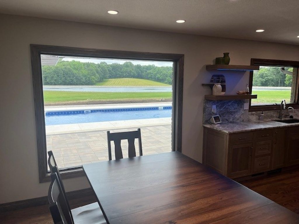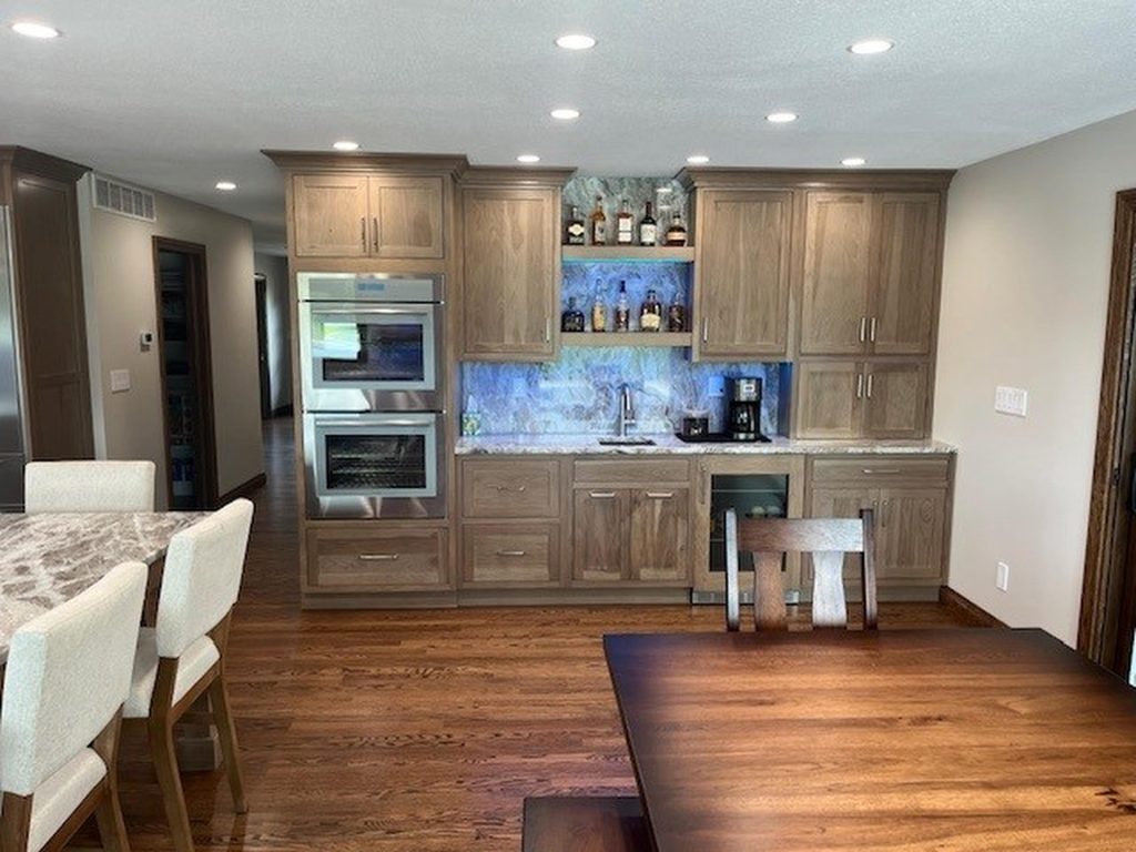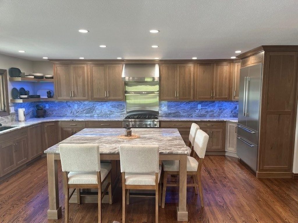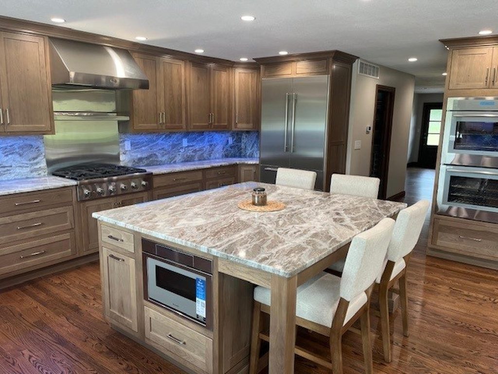 Step into our beautifully designed U-shaped kitchen, where functionality meets elegance. The cabinetry, crafted from clear hickory and stained in a warm Sanibel finish, reaches up to the ceiling, maximizing storage while creating a seamless look.